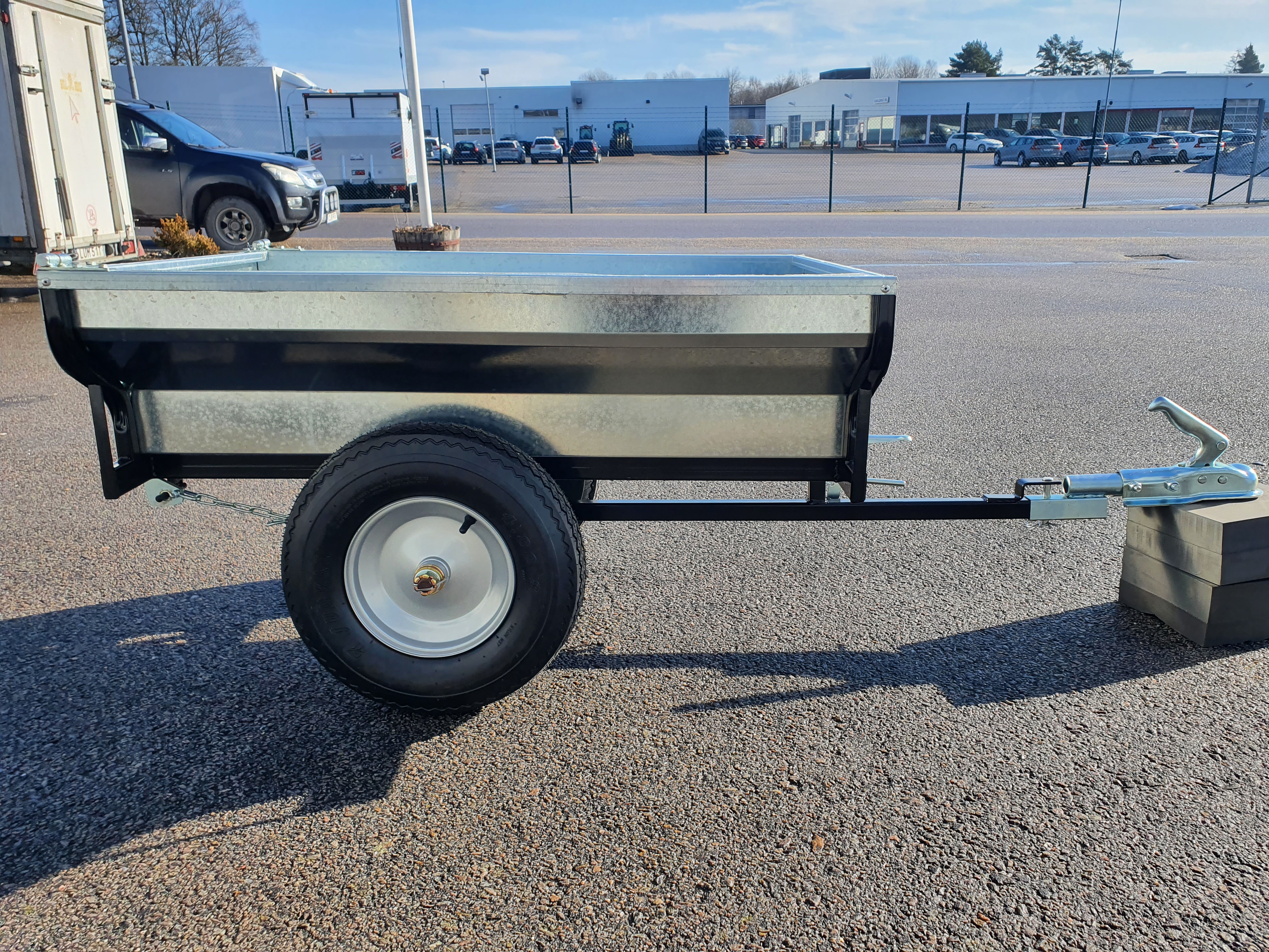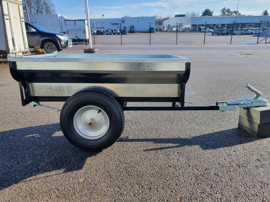 Liten tippvagn Vagn i miniformat för små fyrhjulingar. Flakmått överkant 100cm x 70cm. Flakhöjd 25cm. Vikt 34kg. Passar 50mm kula. 4 995kr